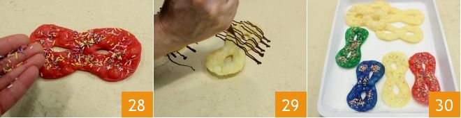 y decorarlas con confeti de colores 28. Podéis pincelar con miel también las blancas, o decorarlas con chocolate negro fundido al baño maría y vertido en una manga pastelera 29 o, también, espolvorear con azúcar glas. Vuestras máscaras de Carnaval están listas para ser devoradas 30.