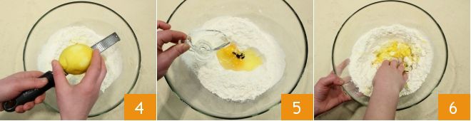 Rallad la cáscara de un limón 4 y por último añadid el vino 5. Comenzad a amasar los ingredientes en el bol 6