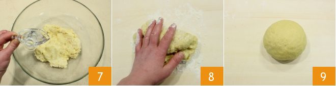 Cuando la masa se haya vuelto más homogénea, añadid la cantidad de agua poco a poco 7, luego amasad y pasad la mezcla a una superficie ligeramente enharinada para trabajarla 8. Formad una bola 9.
