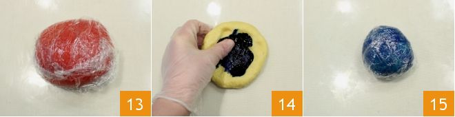 envolved la masa coloreada en papel film transparente 13, luego coloread otra bola de verde y otra de azul (14-15).