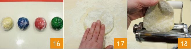 Ahora que todas las masas están listas 16, dejadlas reposar en un lugar fresco durante al menos 30 minutos. Pasado el tiempo necesario podéis formar las máscaras: extendéis la masa blanca con un poco de harina 17 y pasadla por la máquina para estirar la lámina 18;