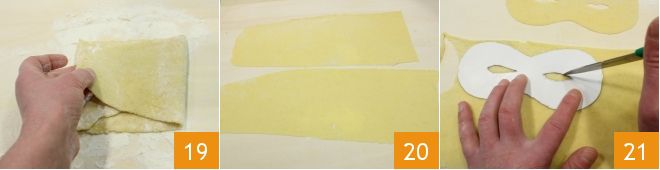 Repetid los pasos en la máquina, doblando cada vez la masa 19 hasta obtener un grosor de aproximadamente 1 mm y 1/2 20. Recortad la pasta descargando aquí la plantilla de la máscara de Carnaval (unos 12-13 cm de largo y 6-7 cm de alto). Recortad también los ojos con la punta de un cuchillo afilado 21.