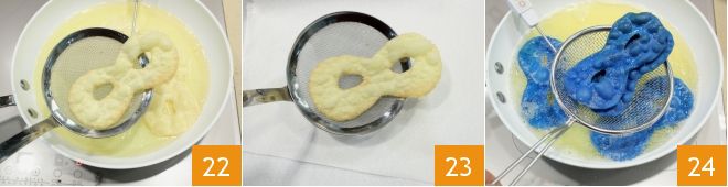Freíd las máscaras en abundante aceite de semillas 1 minuto por cada lado (aseguraos de que el aceite no supere los 170°) 22, luego escurridlas en papel absorbente 23. Luego proceded de la misma manera con la masa azul: pasad la masa en la máquina estirando la lámina fina de 1 mm y 1/2 luego obtened las máscaras y freídlas en abundante aceite de semillas, luego escurridlas 24