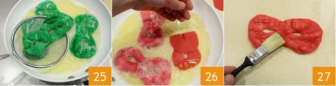 Realizad y cocinad también las máscaras verdes 25 y rojas 26. Una vez escurridas y enfriadas, podéis pincelarlas con miel las máscaras de colores 27