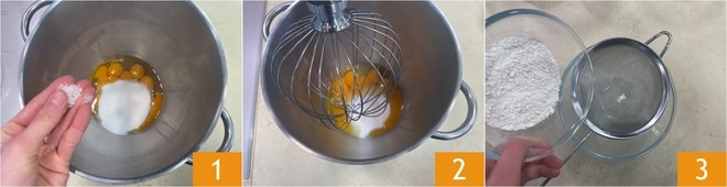 Para preparar la mattonella cassata, comienza con el bizcocho: vierte huevos, azúcar y una pizca de sal en el bol de la batidora 1 y bate la mezcla con las varillas durante unos 10 minutos 2. Mientras tanto, tamiza por separado la harina y la fécula con un colador 3.