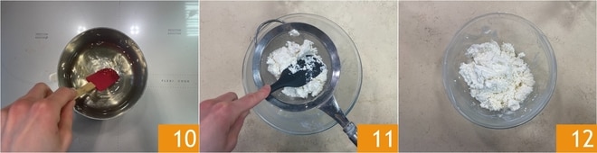 Mezcla y reserva 10. Ocúpate de la crema: tamiza la ricota bien seca 11 en un bol 12.