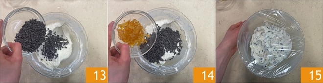Agrega las gotas de chocolate 13 y la naranja confitada cortada en pequeños cubos 14. Mezcla, cubre con film y conserva en el frigorífico 15.