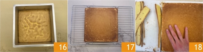 Desmolda el bizcocho 16, deja que se temple, luego dale la vuelta sobre la rejilla 17 y deja que se enfríe completamente. Elimina la costra en los bordes del bizcocho 18.