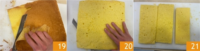 Haz lo mismo también en la base y en la superficie 19, luego corta el bizcocho horizontalmente en 2 partes iguales 20, después divídelo a la mitad y obtén 3 rectángulos delgados 21 del tamaño de tu molde para plumcake: nosotros hemos utilizado un molde de 25x10 cm, de altura 7 cm.