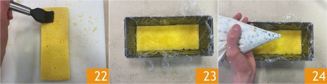 Forra el molde para plumcake con film transparente, luego unta una base rectangular de bizcocho con el almíbar 22. Coloca la primera capa en el fondo 23, pasa la crema a una manga pastelera sin boquilla y rellena con la mitad de la crema 24.