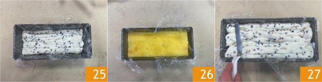 Nivela la superficie con una espátula 25 y coloca un segundo rectángulo de bizcocho 26, luego unta también este con el almíbar. Completa con la crema restante 27 y nivela bien la superficie 27.
