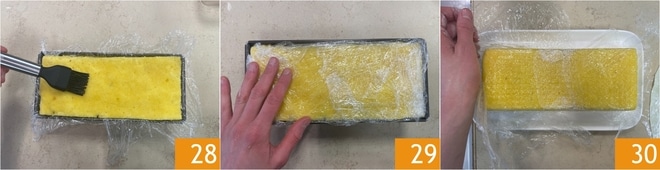 Coloca el tercer rectángulo de bizcocho, úntalo con el almíbar de licor 28 y cierra con el film 29. Guarda en el frigorífico al menos 5 horas o toda la noche. Pasado el tiempo de reposo, recupera el molde endurecido, dale la vuelta sobre el plato de servicio y elimina el film 30.