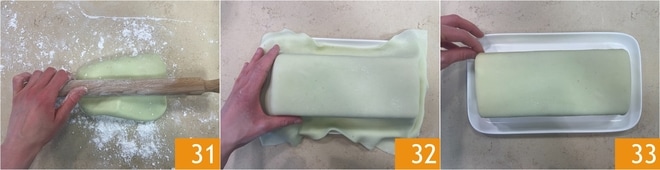 Estira el bloque de mazapán sobre la mesa espolvoreada con azúcar glas utilizando un rodillo 31; deberás obtener una capa de aproximadamente 5 mm de grosor, lo suficientemente grande para cubrir toda la mattonella. Forra el postre con el mazapán 32 y haz que se adhiera bien por todos los lados 33. Conserva en el frigorífico y prosigue con el glaseado real.