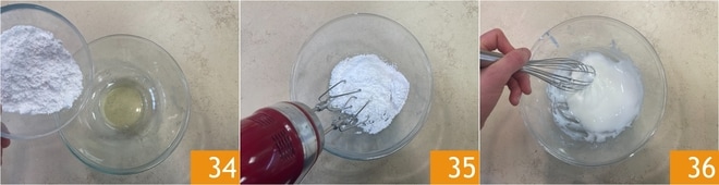 En un bol, vierte las claras de huevo, el jugo de limón y el azúcar glas 34. Bate con las varillas eléctricas 35 hasta obtener una mezcla homogénea 36.