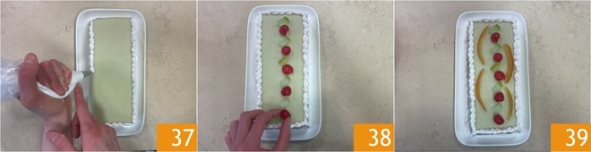 Pasa el glaseado real a una manga pastelera con boquilla redonda de 2 mm y decora todo el borde con un motivo ondulado 37. Adorna al gusto con la fruta confitada 38 y sirve de inmediato tu mattonella cassata 39!