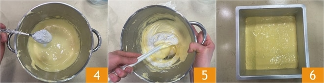 Cuando hayas obtenido una mezcla espumosa, incorpora las harinas tamizadas poco a poco 4 y mezcla con una espátula delicadamente de abajo hacia arriba 5. Vierte la masa en un molde cuadrado de 25x25 cm, bien engrasado y enharinado 6. Hornea en el horno estático precalentado a 180° durante 30 minutos.