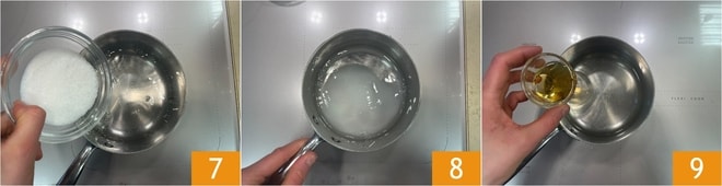 Ocúpate del almíbar: en un cazo, vierte el agua y el azúcar 7 y calienta hasta que el azúcar se haya disuelto completamente 8. Retira del fuego y deja enfriar, luego añade el licor 9.