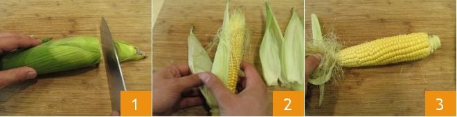 Para preparar la mazorca al papillote, primero quita la parte final 1, luego despójala cuidando de reservar las hojas más internas 2. También corta la barba que se encuentra en el interior 3.