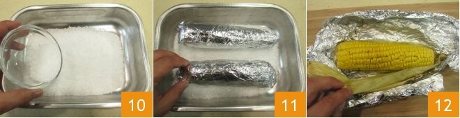 Toma una bandeja de horno, espolvorea el fondo con una capa de sal gruesa y coloca las mazorcas al papillote 11 y cocina en horno estático precalentado a 180° durante 35 minutos. Una vez cocidas, saca las mazorcas, déjalas enfriar antes de servirlas 12.