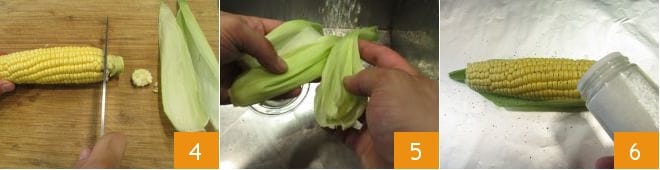 Recorta la base del marlo, es decir, la parte interna a la que están adheridos los granos 4, reserva las mazorcas y lava las hojas que has reservado bajo el chorro de agua corriente 5, luego sécalas con un paño. Ahora toma un hoja de papel de aluminio y coloca una hoja en el centro, pon encima la mazorca, sal 6,