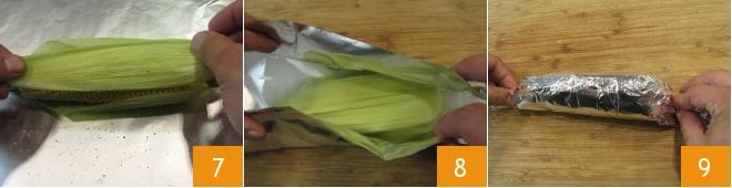 pimienta y envuélvela con otras hojas 7 de manera que cubras el marlo por completo. Ahora envuelve también el papel de aluminio alrededor de la mazorca 8 sellando bien los dos extremos 9.