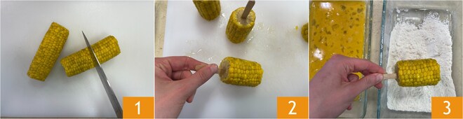 Para preparar las mazorcas fritas, comienza precisamente con las mazorcas. Nosotros hemos usado las precocidas, solo tienes que dividirlas por la mitad 1 y luego pincharlas en el centro con un palillo 2, como el de los helados. Ayúdate con un mazo de cocina para esta operación porque la parte central de las mazorcas es bastante dura. Pasa al empanado: pásalas primero por la harina 3.