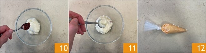 Mientras fríes las mazorcas, puedes dedicarte a la salsa picante: vierte la mayonesa en un cuenco y añade la pasta de pimiento 10. Mezcla y transfiere a una manga pastelera 12.