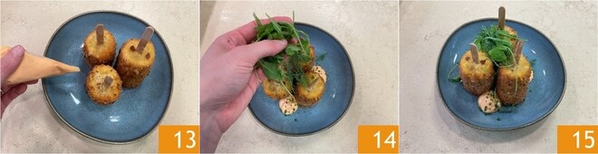 Para emplatar, coloca las mazorcas con el palillo hacia arriba, exprime unos montoncitos de mayonesa de pimiento 13 y decora con la rúcula 14, el eneldo y el cebollino. ¡Aquí tienes tus mazorcas fritas listas, disfrútalas de inmediato 15!