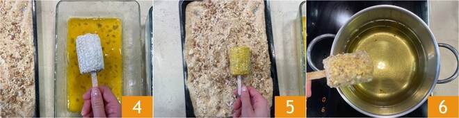 Luego por los huevos batidos 4 y, finalmente, por el pan rallado 5. Fríe 1-2 piezas a la vez en aceite a 170°C durante unos 5-7 minutos 6.