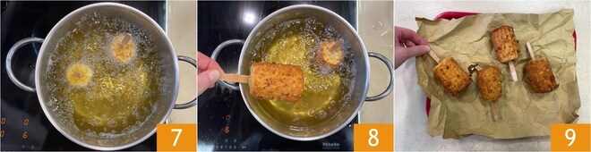 Asegúrate de que estén bien sumergidas en el aceite 7 y, cuando estén bien doradas 8, escúrrelas sobre una bandeja cubierta con papel para frituras 9. Sala al gusto.