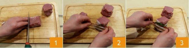 Para preparar el medallón de cerdo al roquefort, empezad cortando el lomo en 4 filetes de aproximadamente 200 g cada uno 1. Luego envolvedlos con una loncha de panceta 2, adherid a los lados del filete 2 hojitas de salvia y cubrid con otra loncha de panceta 3.