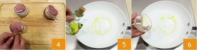 En este punto atad los filetes con hilo de cocina para que durante la cocción mantengan mejor la forma 4. Ahora que la carne está lista, preparad la sartén para la cocción: verted un chorrito de aceite 5 y añadid la mantequilla 6 para que se derrita a fuego bajo.