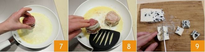 Colocad los filetes de cerdo 7 y cocinadlos a fuego medio durante unos 4 a 6 minutos por cada lado según prefiráis la cocción (es mejor no cocinarlos demasiado tiempo para evitar que la carne quede seca); durante la cocción, giradlos también del otro lado 8. Mientras tanto, cortad el queso roquefort en trozos 9.