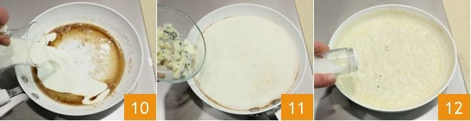 Una vez listos los medallones, reservadlos y en la misma sartén de la cocción verted la nata 10 y añadid el roquefort 11; dejadlo derretir a fuego medio, salpimentad al gusto 12 y removed de vez en cuando con una cuchara de madera.