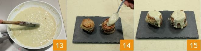 Cuando la salsa se haya espesado 13, apagad el fuego, condimentad los medallones de cerdo con un poco de salsa (14-15) y verted la restante en una jarra para servirla aparte a vuestros invitados!