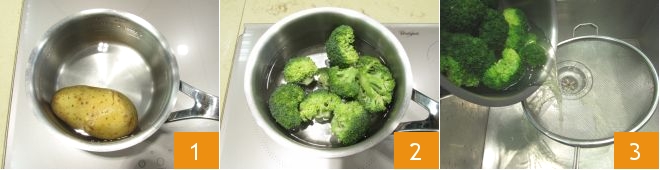 Para preparar los medallones de merluza y brócoli, lo primero es dejar que los filetes de merluza se descongelen en la nevera durante al menos 2-3 horas. Después poned al fuego dos cazuelas con agua para llevar a ebullición; en una introducid las patatas bien lavadas cuando el agua aún esté fría, y cuando hierva contad unos 30-40 minutos 1: el tiempo puede variar según el tamaño de las patatas, así que acordaos de comprobar la cocción pinchándolas con un tenedor. Mientras tanto, lavad los brócoli, ponedlos en la otra cazuela cuando el agua alcance el hervor y hervidlos unos 5 minutos 2. Luego escurrid los brócoli 3