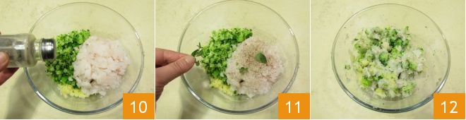 salad, añadid pimienta 10 y añadid las hojitas de mejorana 11, luego amasad con las manos para integrar todos los ingredientes 12.