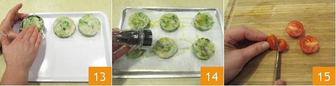 Tomad un poco de masa y dadle forma con un cortapastas de 6,5 cm de diámetro para formar los medallones 13: con estas cantidades deberíais obtener 6. Pasad los medallones a una bandeja cubierta con papel de hornear, aliñadlos con un chorrito de aceite y añadid otra pizca de pimienta 14, luego cocedlos en el horno estático precalentado a 200° durante unos 20 minutos. Mientras los medallones están en el horno, preparad la guarnición: lavad y cortad los tomatitos por la mitad 15;