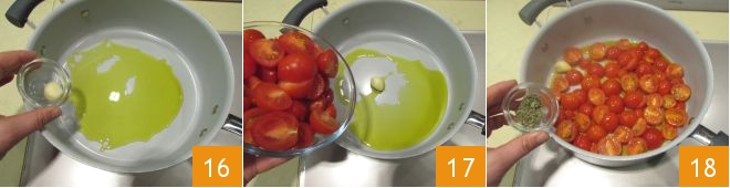 calentad el aceite en una sartén, añadid el ajo pelado pero entero 16 y doradlo brevemente, luego incorporad los tomatitos 17, añadid la sal y el orégano 18 y dejad cocer a fuego medio durante unos 15 minutos. Cuando los tomatitos estén cocidos, retirad el diente de ajo de la sartén.