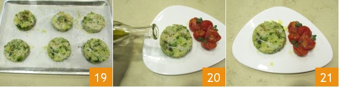 Transcurrido el tiempo de cocción de los medallones, sacadlos del horno 19 y pasadlos a una fuente; colocad a un lado los tomatitos aún calientes, añadid unas hojitas de mejorana y aliñad con un chorrito de aceite crudo 20. ¡Vuestros medallones de merluza y brócoli están listos para servir 21!
