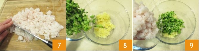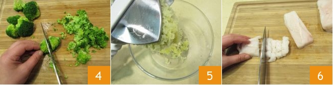 luego picadlos groseramente con un cuchillo 7. Cuando las verduras se hayan enfriado, coged el bol donde aplastasteis las patatas, añadid los brócoli 8 y la merluza picada 9,