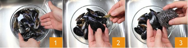 Para preparar los mejillones a la busara, lo primero que deben hacer es ocuparse de la limpieza de los moluscos. Enjuáguenlos bajo agua corriente 1 luego, utilizando el dorso de un cuchillo, eliminen todas las protuberancias externas. En este punto, utilizando las manos, quiten la barba 2 y finalmente, ayudándose de un estropajo de acero, limpien toda la superficie. Para cualquier duda pueden consultar nuestra escuela de cocina: Cómo limpiar y abrir los mejillones.