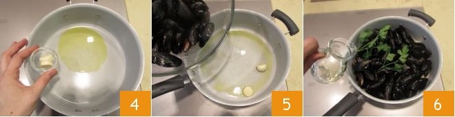 Pelen los dos dientes de ajo y pónganlos en una cacerola donde habrán puesto a calentar un poco de aceite 4. Déjenlos dorarse y luego añadan también los mejillones 5 y los ramilletes de perejil; Desglasen con el vino blanco 6