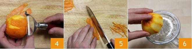 Pele la naranja con cuidado, ayudándose con un pelador 4, y saque solo la cáscara, que luego cortará en juliana 5. Corte la naranja en 2 y exprímala, reservando el zumo 6.