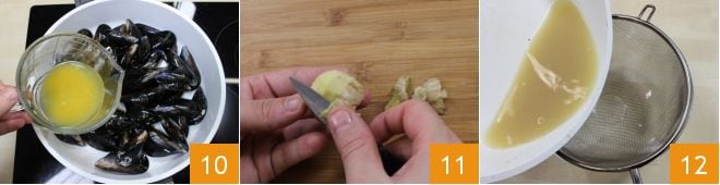 y el zumo de naranja 10 y continúe la cocción, siempre a fuego vivo, hasta que las conchas de los moluscos se hayan abierto por completo. Una vez listos, reserve los mejillones y manténgalos calientes, luego pele el jengibre 11 y filtre el líquido de cocción 12, que volverá a poner al fuego