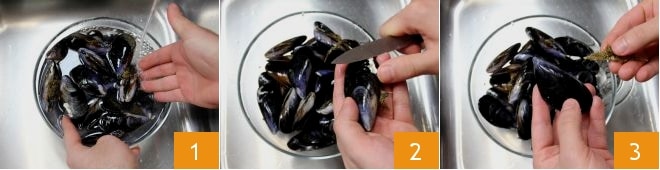 Para preparar los mejillones a la tarantina, primero ocúpate de la Cómo limpiar y abrir los mejillones. Enjuaga los mejillones bajo agua corriente 1, luego, utilizando el dorso de un cuchillo pequeño, elimina todas las impurezas externas 2 y arranca la barba con un movimiento decidido 3.