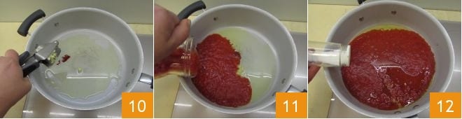 Vierte en otra cacerola la parte restante de aceite, añade el chile y el otro diente de ajo machacado 10, deja dorar el sofrito a fuego muy bajo, removiendo de vez en cuando. Luego añade la pulpa de tomate 11, condimenta con un poco de pimienta y una pizca de sal (solo una pizca porque los mejillones ya son muy sabrosos), teniendo cuidado de no excederte porque los mejillones resultarán ya muy sabrosos 12. Deja cocinar la salsita por 5-6 minutos, removiéndola de vez en cuando.