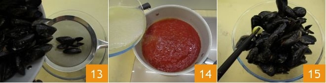 Filtra los mejillones recogiendo el caldo en un tazón 13, para verterlo más fácilmente en la salsita 14. Deja cocinar por otros 10 minutos; mientras tanto, quita de los mejillones el ajo 15 y el perejil y resérvalos.