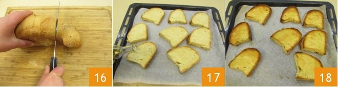 Solo falta el acompañamiento crujiente: corta el pan pugliese 16, colócalo en una bandeja para hornear cubierta con papel de horno y rocíalo con un poco de aceite 17, luego tuéstalo unos minutos en el horno bajo el grill a 250° durante 3 minutos, hasta que esté bien dorado 18.