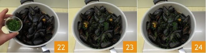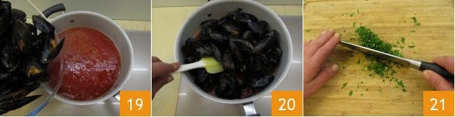 Una vez que la salsa esté lista, añade los mejillones 19 y mezcla 20. Luego pica finamente el perejil 21